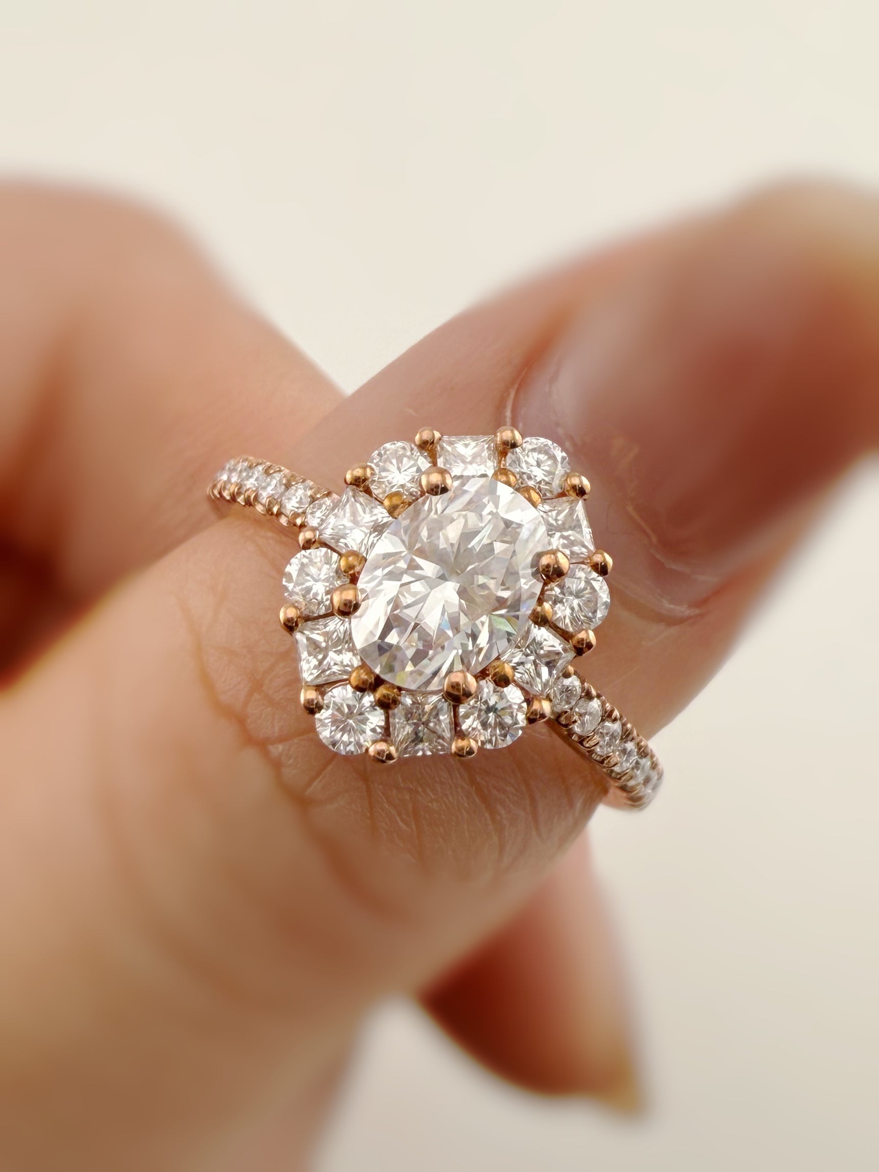 Elevate your jewelry collection with our stunning Oval-Cut Halo Pavé Diamond Ring, a perfect blend of modern sophistication and classic charm. This unique engagement ring features a mesmerizing oval-cut center stone, encircled by a dazzling halo of pavé-set diamonds for maximum brilliance. The delicate pavé diamond band adds an extra touch of luxury, making this ring a true showstopper.